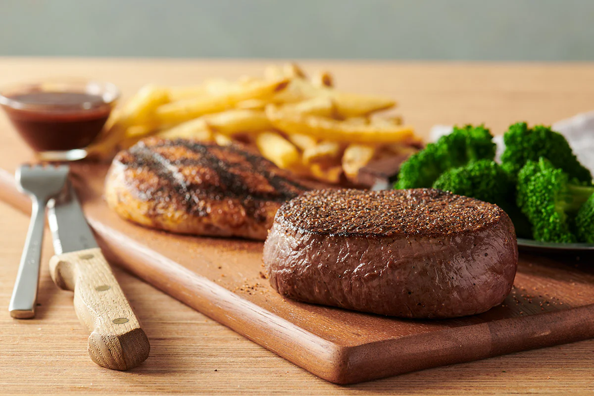 Our signature center-cut sirloin with 6 oz. Grilled Chicken on the Barbie. Served with two freshly made sides.